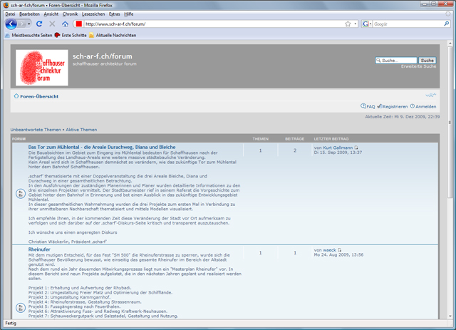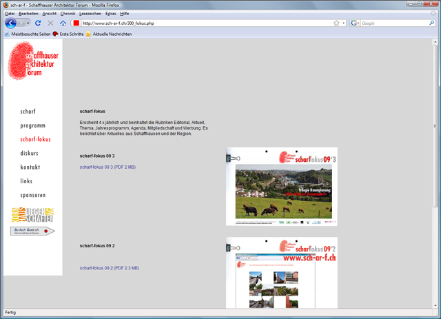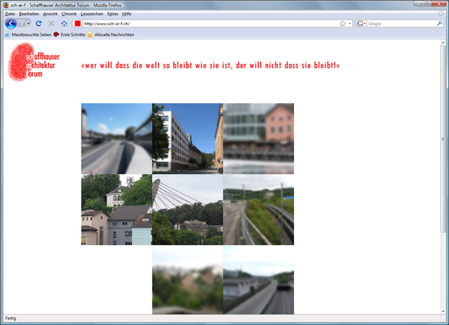 Das Architektur Forum thematisiert und diskutiert verschiedene Planungs- und Bauvorhaben in der Region Schaffhausen. Es wird fokussiert. Die Startseite mit einem "Architektur-Puzzle" und die kleine Animation "fokussieren" illustrieren diese Absicht. Die Publikation des Forums, der "scharf-fokus", kann in Form von PDF-Dokumenten heruntergeladen werden. Mit einem Online-Forum können die einzelnen Themen vertieft diskutiert werden.
