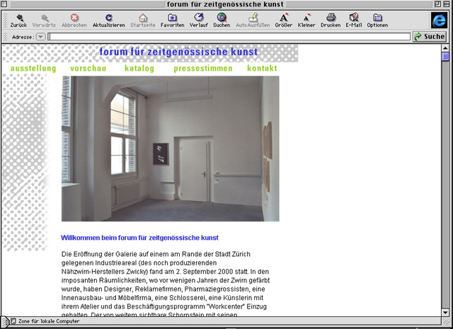 Der Internetauftritt präsentiert die Galerie und ihr Programm. Durch ein einheitliches Bild-Text Konzept können die Abbildungen zunächst in der Rubrik 'Vorschau', dann unter 'Ausstellung' und schliesslich unter 'Katalog' eingesetzt werden. Das Konzept regelt und vereinfacht die durch den Galeriebetrieb periodisch erforderliche Erneuerung des Websites. Aufgrund der besonderen Lage am Stadtrand von Zürich wird der Anweg zur Galerie mit zwei Plänen und einer kurzen Bildreihe dokumentiert.