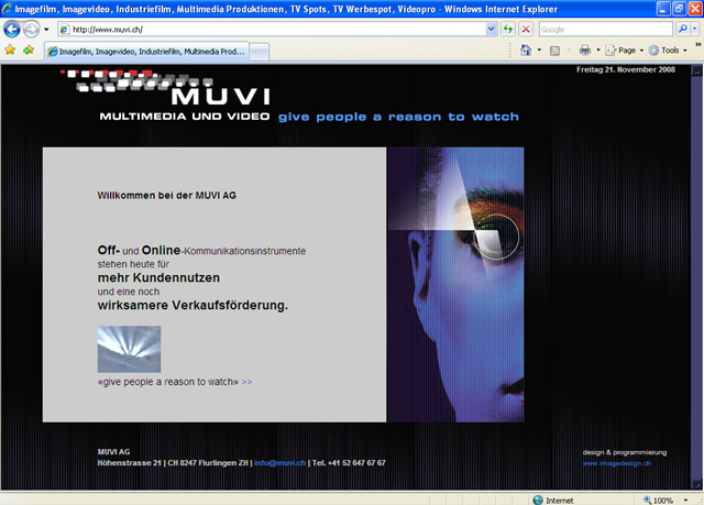 Die Firma MUVI AG ist im Bereich Werbe- und Imagefilm für Grossunternehmen tätig. Der Internetauftritt richtet sich an ein Publikum mit Breitband-Internet-Anschluss. Über 30 Filmbeispiele sind online abrufbar. Die Filme sind im Format 'Flash', weil dieses Plugin sehr weit verbreitet ist.