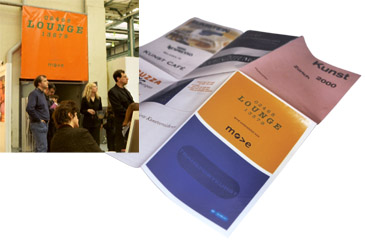 Die Image-Firma 'move' betreibt innerhalb der Kunstmesse in Zürich-Oerlikon eine Bar mit Sofas und Sitzplätzen – dergleichen wird im Trend-Jargon als 'Lounge' bezeichnet. Das Label – auf einer grossen Blache aufgedruckt – soll die Gäste auf den Eingang der Lounge hinweisen. Der typografische Stil und die Farben verweisen auf die 70er Jahre – einhergehend mit dem aktuellen Modetrend.