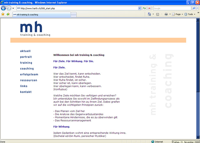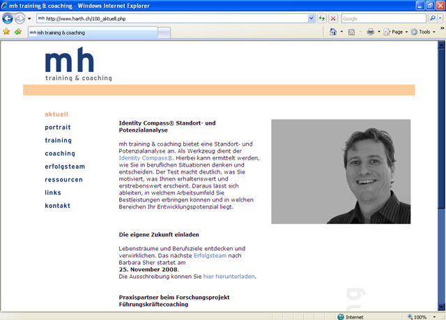 Michael Harth bietet Training und Coaching mit der Spezialisierung für Anwälte und Juristen an. Das Erscheinungsbild ist formal reduziert auf die Initialen "mh" mit dem Zusatz "training & coaching". Als Farben wurden Dunkelblau, Grau und Orange verwendet. Auf der rechten Seite erscheinen ganz dezent Schlagwörter und Merksätze aus dem Bereich Coaching wie "veränderungen einleiten". Auf der Startseite erscheint in der selben Art eine kleine Animation. Mit Hilfe meines CMS kann der Kunde die Inhalte selbst updaten (siehe