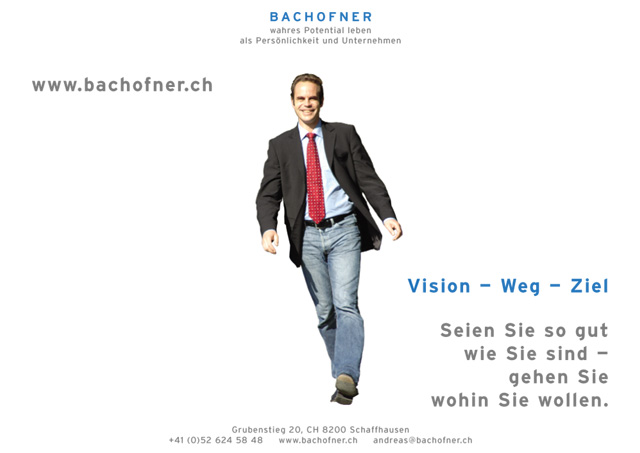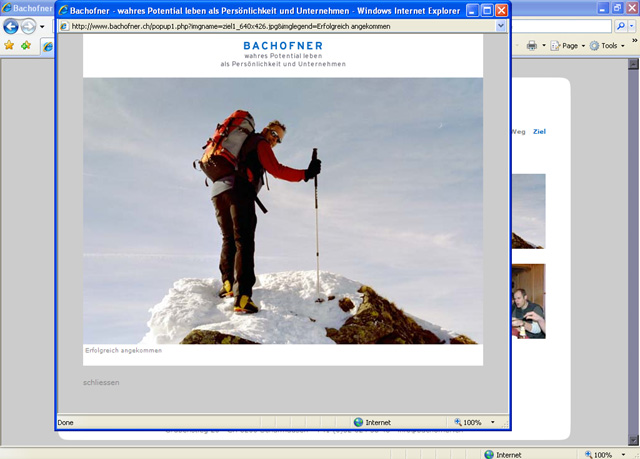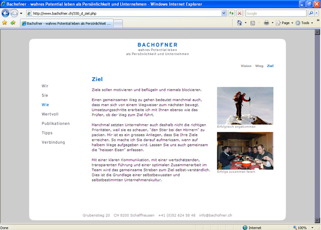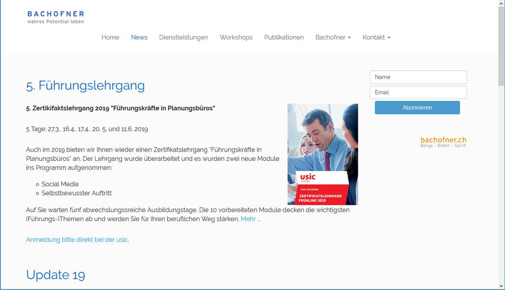 Andreas Bachofner führt Seminare zur Teamentwicklung und Kommunikation durch. Zudem ist er ein begeisterter und talentierter Fotograf. Mit der Internetseite hat er ein Instrument, mit welchem er rasch aktuelle Nachrichten oder Rückschauen z.B. zu Kursen selbst publizieren kann. Das Layout der Seite ist immer in der gleichen Grösse und erzeugt so einen kompakten, einheitlichen Eindruck. Auf der rechten Seiten können jeweils zwei Bilder mit einem Vergrösserungs-PopUp eingesetzt werden.