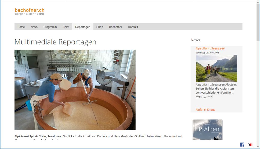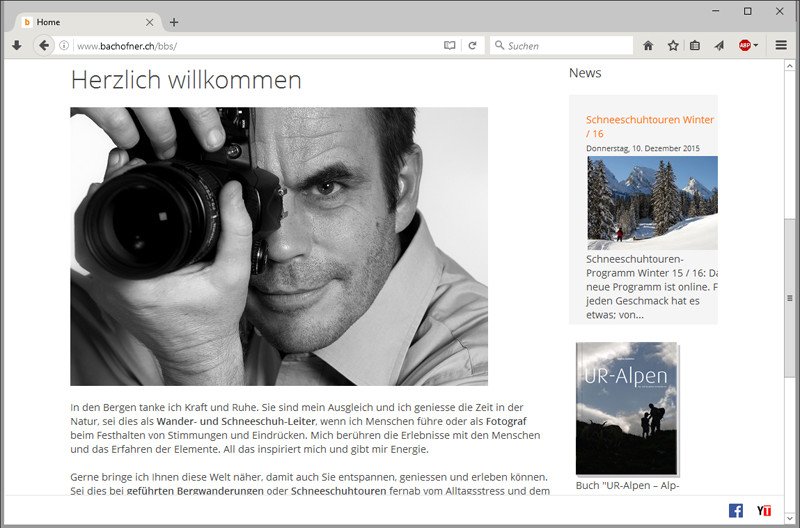 Die Webseite ist mit Joomla aufgebaut. Andreas Bachofner führt Wandertouren durch, die er auf diesem Internetauftritt bewirbt. Auf Anregung des Kunden habe ich aktuelle Features wie News- und Titelslider als Module eingebaut und konfiguriert. Sie stellen von der Kommunikation her Anreize dar, einen Artikel zu lesen. Beworben wird mit vielen Bildern, die mit kurzen Texten versehen sind. Die Wanderungen (geführte Touren) und Bestellangebote (Bücher und Grusskarten) können über mehrstufige Formulare gebucht und bestellt werden. Die Bilder werden mit einem Galerie-Modul (Phoca-Gallery) präsentiert. Ich vermittle den Kunden die Benutzung der verwendeten Module in kurzen Einführungen auf einer lokalen Installation der Webseite.