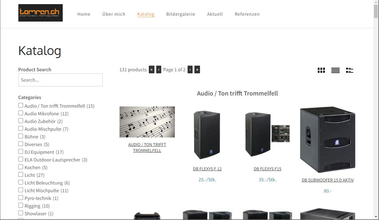 Der Kunde betreibt nebenberuflich einen Verleih von Musikanlagen und weiteren Accessoires, die für eine Party notwendig sind. Die Webseite ist mit WordPress aufgebaut. Für den Katalog wurde ein umfangreiches Modul installiert, mit dem der Kunde seine Produkte selbst eingeben und updaten kann. Die Fotos und das Logo stammen vom Kunden.