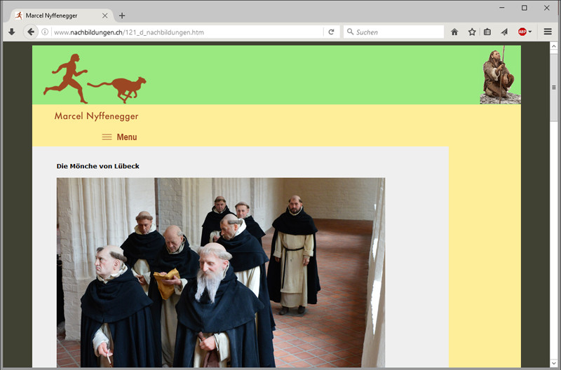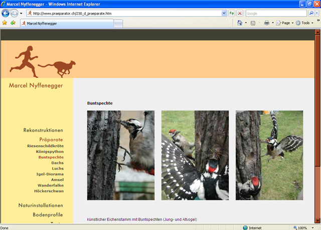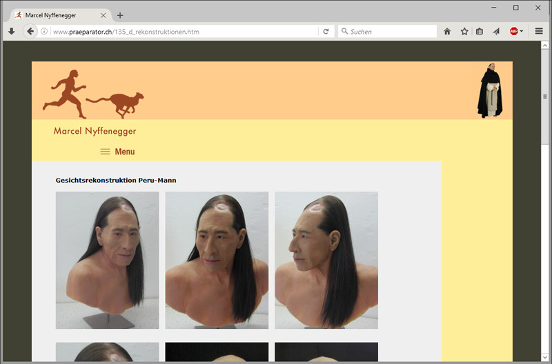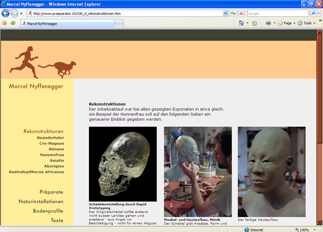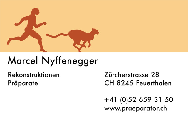 Marcel Nyffenegger erlangte 2008 an der Weltmeisterschaft der Präparatoren den Weltmeistertitel. Durch die gesteigerte Aufmerksamkeit entstand das Bedürfnis, das Erscheinungsbild und den Internetauftritt zu professionalisieren. Um dem Gebiet der Rekonstruktionen mehr Gewicht zu geben, zeichnete ich einen rennenden Neandertaler, welcher sich mit dem ursprünglich vorhandenen Geparden ergänzt. Durch dieses Emblem werden die zwei Haupttätigkeiten, das Rekonstruieren von prähistorischen Menschen und das Präparieren von Tieren symbolisiert. Die Farben sind inspiriert durch prähistorische Felsmalereien. Zusammen mit dem Internetauftritt wurde eine Visitenkarte entworfen und realisiert.