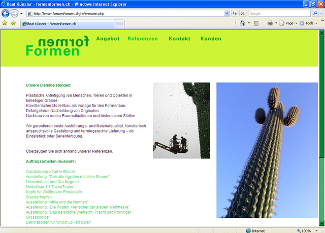 Der Internetauftritt präsentiert die Referenzarbeiten des Künstlers. Die Gestaltung erfolgte in Zusammenarbeit mit dem Kunden; die enge Eingrenzung auf drei Grüntöne bei der Farbgestaltung war seine Anregung. In diesem Sinn sollen nicht nur die Werke gezeigt werden, sondern auch der dahinter stehende Gestalter mit seinen hohen ästhetischen Qualitäten. Nicht zufälligerweise hat sich der Aufgabenbereich von Beat Künzler in den letzten Jahren ausgehend von klassischen Bildhauerarbeiten hin zu gestalterisch wie auch unternehmerisch fordernden Grossprojekten bewegt.