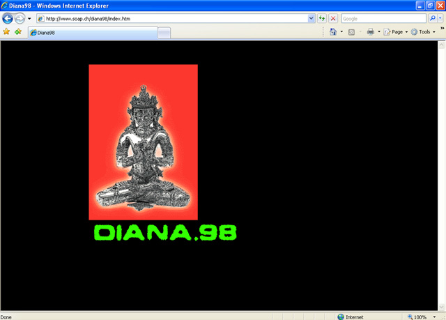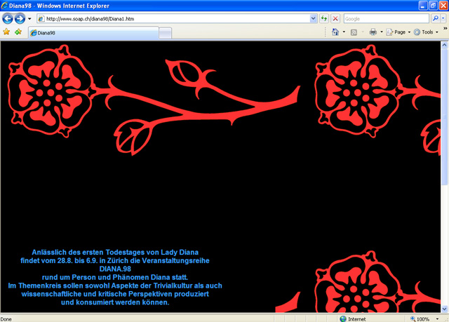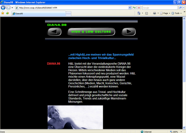 Die Künstlergruppe stellt sich und ihre Absicht - den einjährigen Todestag von Prinzessin Diana zu inszenieren - vor. Der Stil der Seite ist expressiv gestaltet, die Navigationsteile erinnern an jene eines Armaturenbretts... Im Allgemeinen soll die Internetseite den Anlass DIANA.98 als 'Szene-Event' dokumentieren und bleibt als Erinnerung stehen. Das von mir entworfene DIANA.98 - Logo wurde auch auf den Drucksachen benutzt. Das Titelbild (Buddha) stammt vom Künstler Nik Emch.