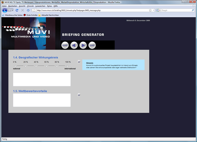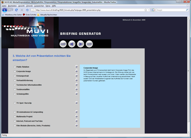Mit dem Briefing-Generator können Offerten-Anfragen für Filmprojekte online erfasst werden. In fünf Schritten wird der Kunde zur Ausrichtung und zum Umfang seines Filmprojekts befragt. Die Angaben werden dabei im Hintergrund zusammengefasst und am Schluss per Email an die Firma MUVI übermittelt. Aus Gründen des Datenschutzes werden keine Informationen abgespeichert - sobald der Kunde das Browserfenster geschlossen hat, sind die Eingaben gelöscht.