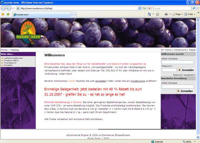 Im August 07 konfigurierte ich den Internet-Shop, welcher dem neuen Internetauftritt angegliedert ist. Der Shop basiert auf xt-commerce. Er ist so konfiguriert, dass nur Detailhändler mit einem Account die Produkte einsehen können.