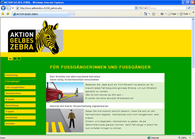 Unter der Trägerschaft der Organisationen "Fussverkehr Schweiz" und "verkehrssicherheit tcs" wurde im April 04 die Aktion "Gelbes Zebra" lanciert. Mit einem Content Management System können die Kunden den Inhalt des Websites jederzeit erneuern und erweitern. Der Internetauftritt ist in drei Sprachen gehalten; es kann dynamisch zwischen den Sprachen umgeschaltet werden.