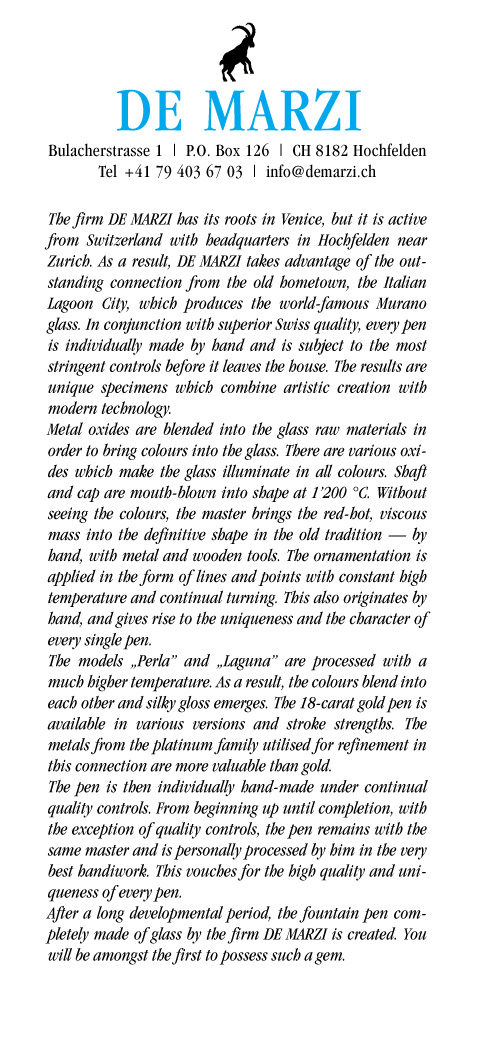 Walter De Marzi stellt Füllfederhalter aus Murano-Glas her. Die Zusammenarbeit mit ihm begann im Frühjahr 05 mit der Realisierung einer Visitenkarte. 2007 gestaltete ich einen Produkteprospekt, in dem alle acht Modelle präsentiert werden. Der Prospekt erschien in zwei Sprachen (Englisch und Deutsch). Im Herbst 07 entwarf ich ein Firmenemblem, auf Wunsch des Kunden ein Steinbock, der zusammen mit dem Schriftzug das Logo bildet. Der Steinbock ist so umgesetzt, dass er auch in einer sehr kleinen Grösse in die Federn eingraviert werden kann. Im Frühjahr 08 gestaltete ich eine Garantiekarte und eine Firmenkarte, welche beide auf hochwertigem Büttenpapier gedruckt wurden. Die technischen Zeichnungen bei der Garantiekarte zeigen die korrekte Handhabung der Füllfedern. Im Sommer 08 erstellte ich eine einfache Internetseite. Weiter entstanden neue, hochwertige Fotos von den Füllfederhaltern. Durch die feinen Ziselierungen der Federn ist das exakte Fotografieren relativ schwierig. Um Schärfeunterschiede zu verhindern, wurden die Füllfederhalter in waagrechter Position aufgenommen.