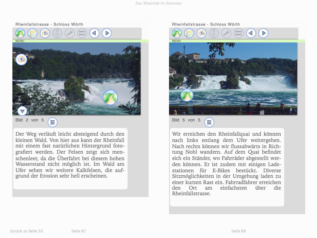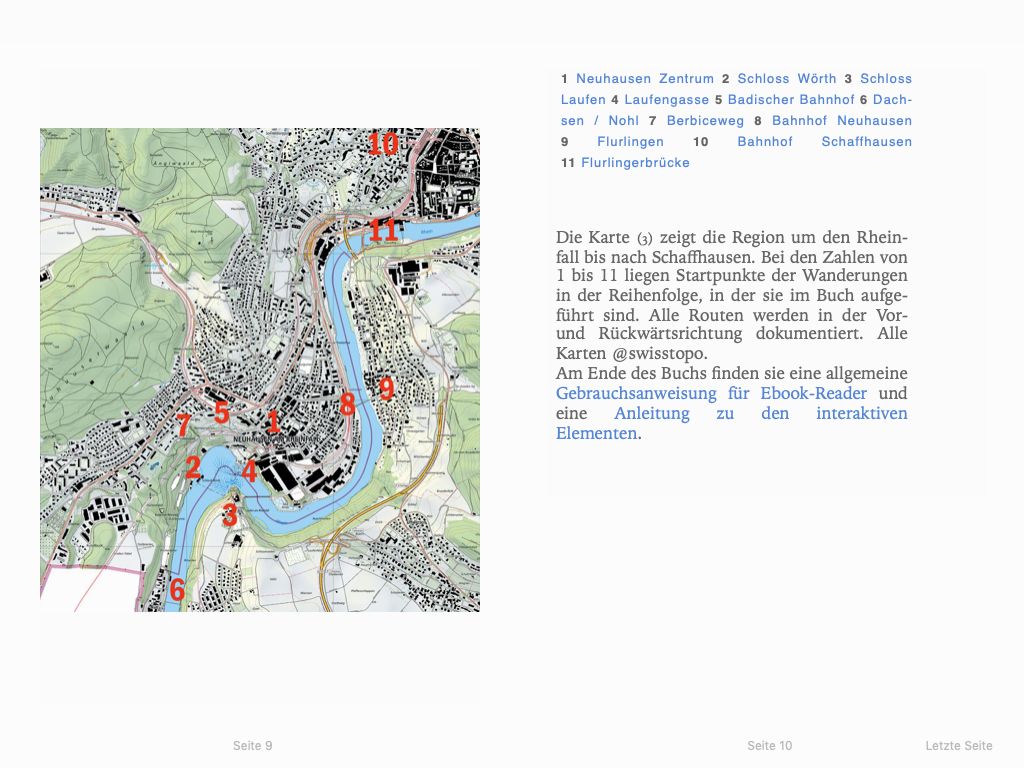 Dieses sorgfältig editierte Buch beschreibt einfache Wanderungen rund um den Rheinfall. Die 33 Routen werden mit über 300 Fotos und gut recherchierten Texten, die auch auf die Geschichte der Region eingehen, dokumentiert. Hinzu kommen neun grossformatige Panorama-Aufnahmen – alle Fotos sind im Sommer entstanden und zeigen den Rheinfall bei einem hohen Wasserstand. Das Buch enthält Hinweise zum Baden im Rhein und Tipps, wie sie selbst schöne Fotos vom Rheinfall machen können. Es lebt von der Fülle der beschriebenen Details und lohnt sich nicht nur für Wanderer, sondern auch für Leute, die gerne Fotobücher anschauen.